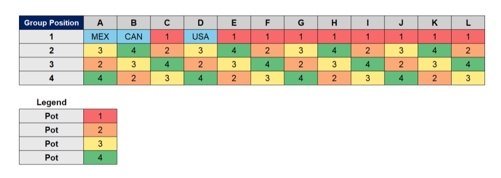 ポット分けは、まず開催国の3カ国がポット1に割り当てられ、残りの国々は2025年11月発表のFIFAランキングに基づいてポット上位から12カ国ずつ4つのポットに振り分けられます。